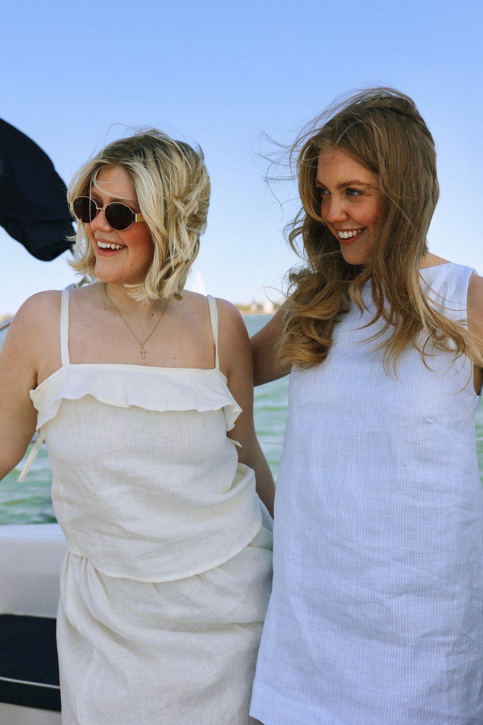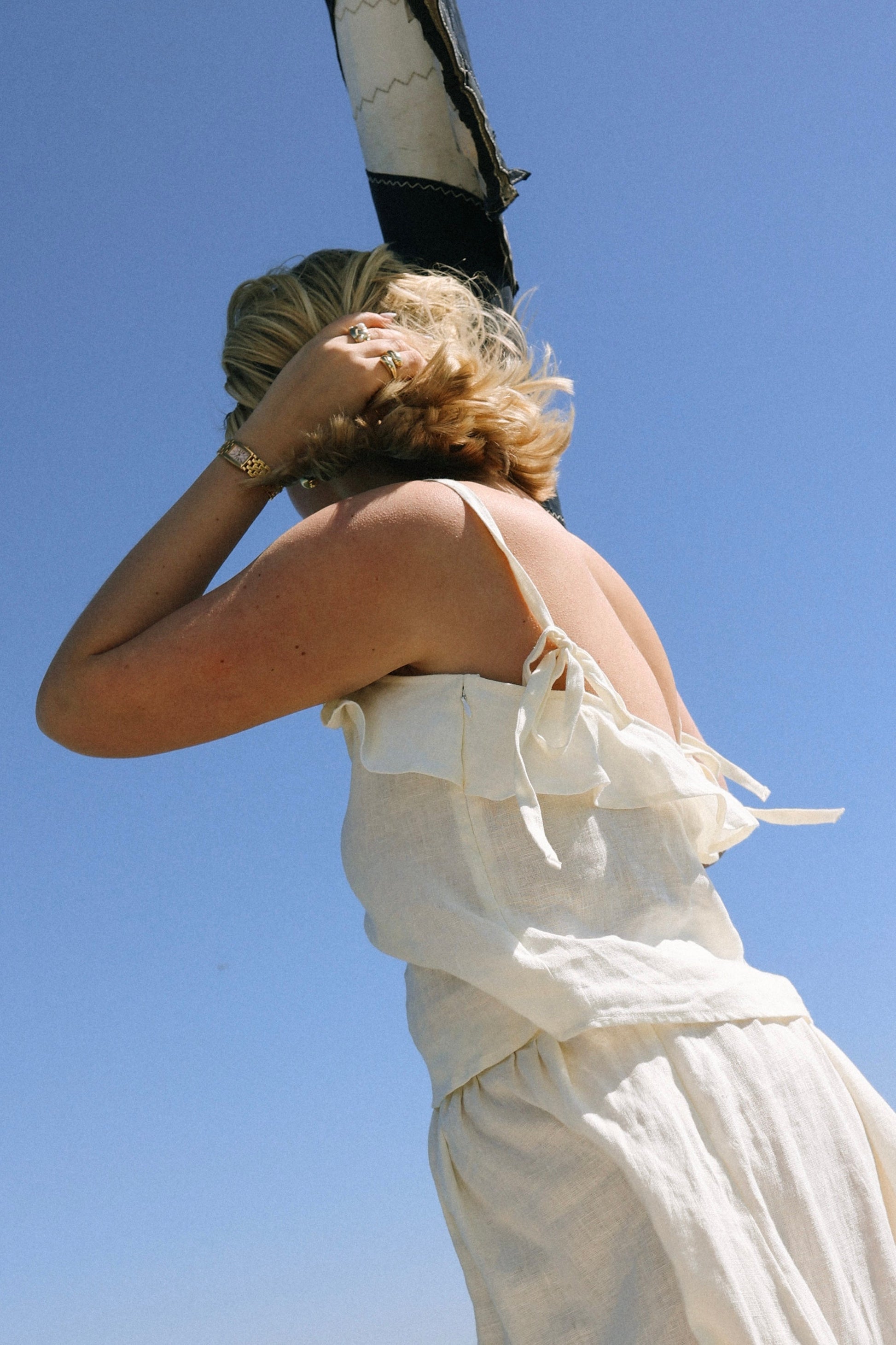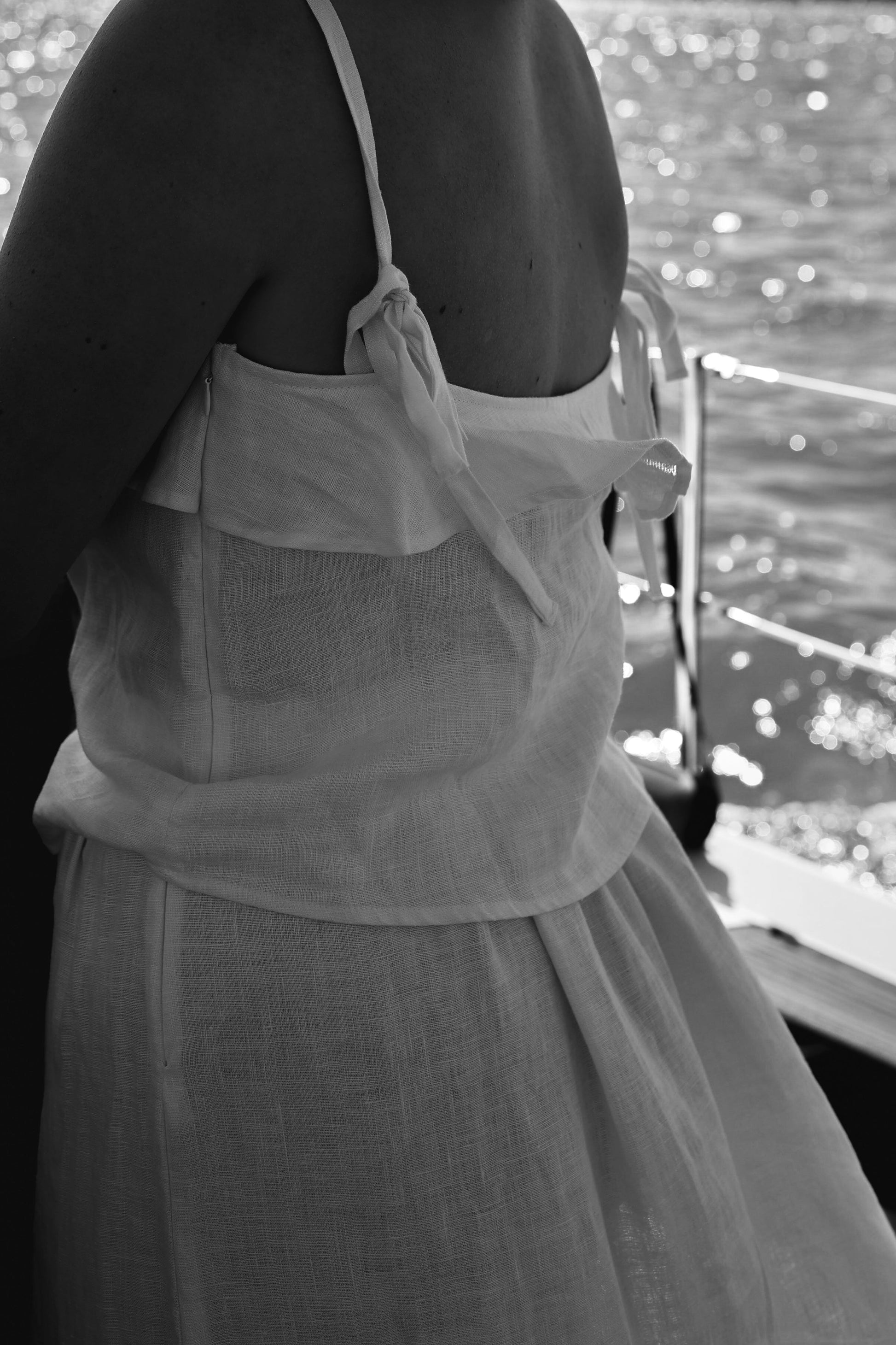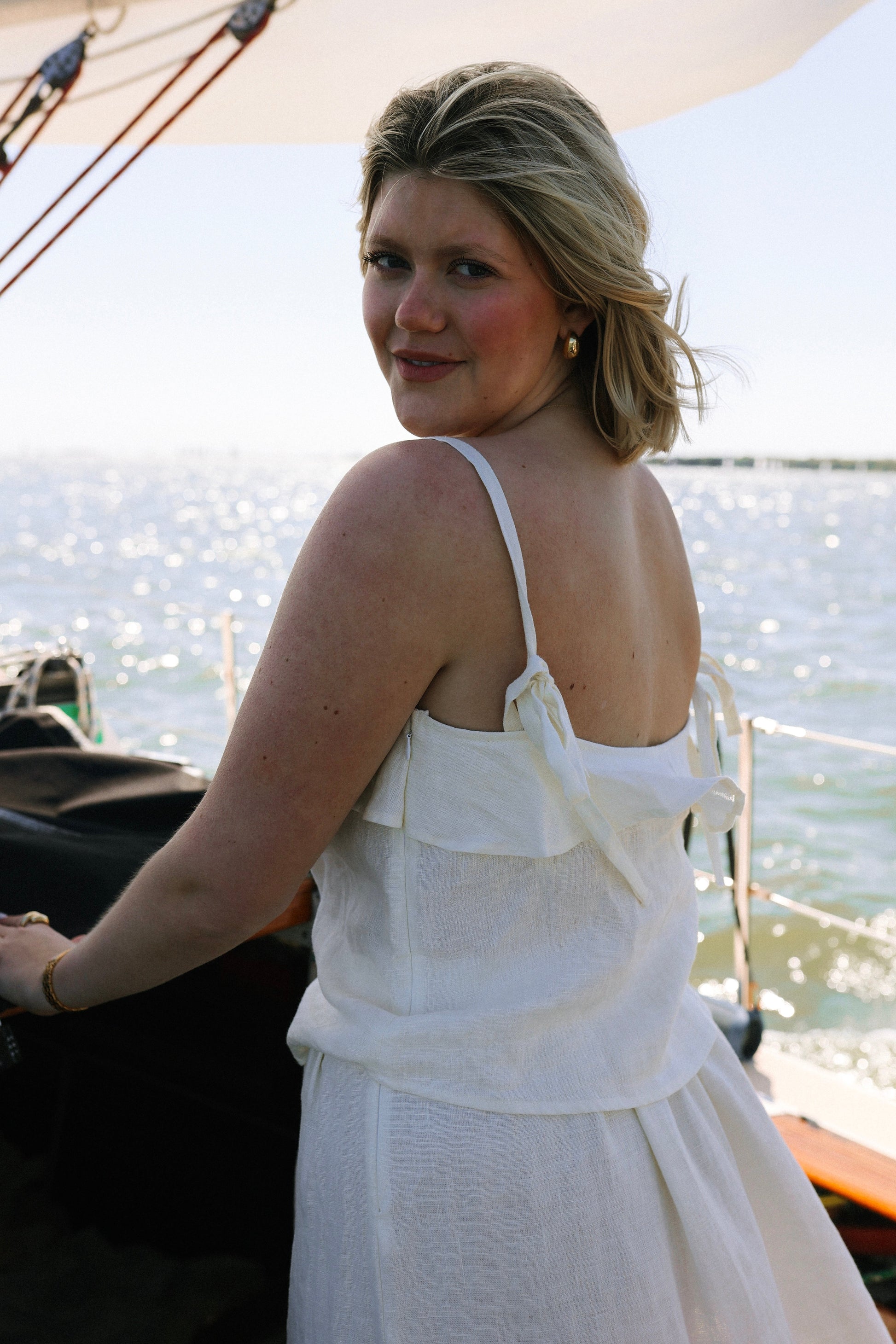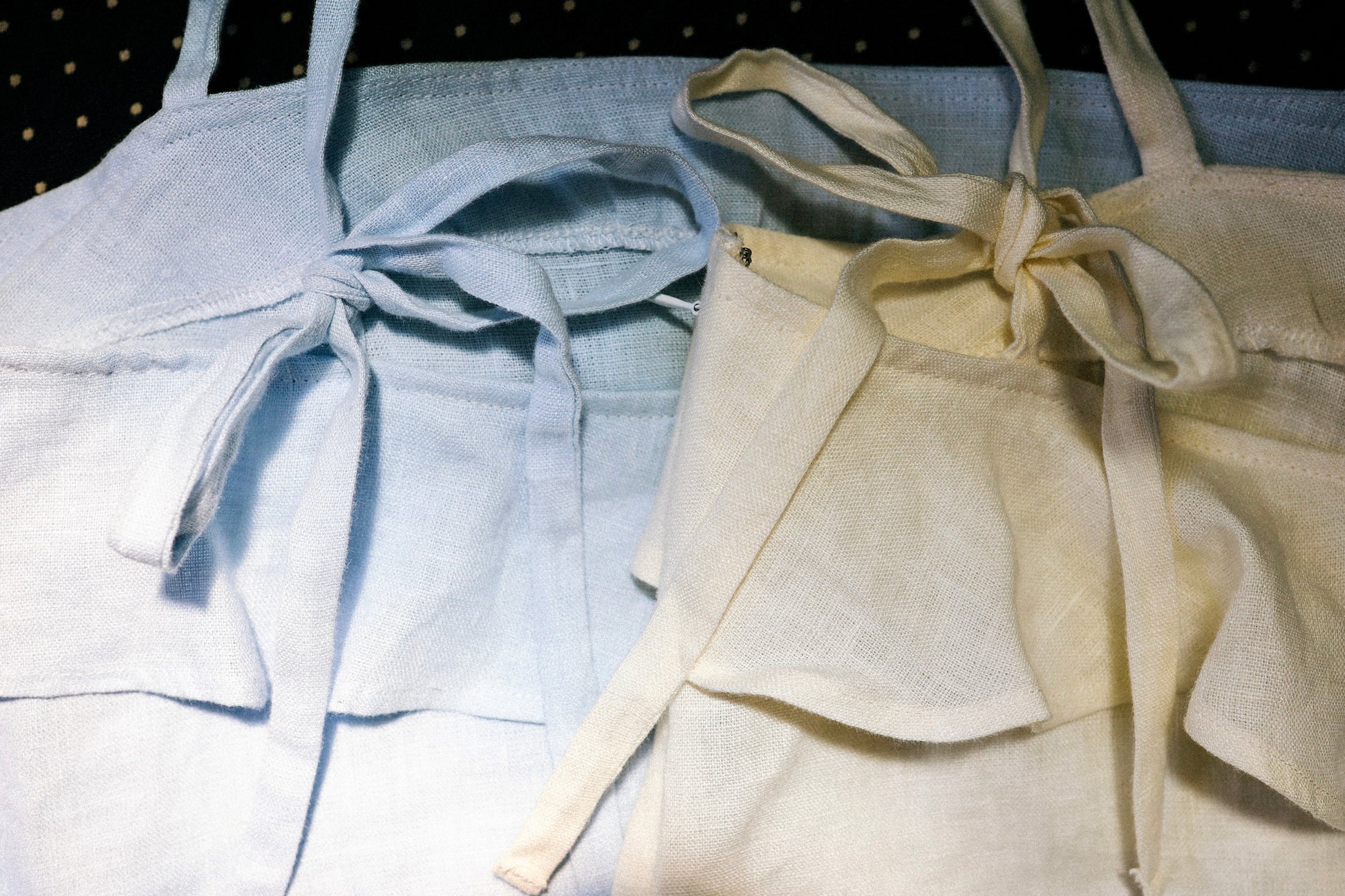 Crafted from European linen, The Grace is light, breathable, and beautifully detailed. With adjustable tie straps, delicate back bows, and a soft ruffle framing the neckline, it offers a playful twist on a classic shape.